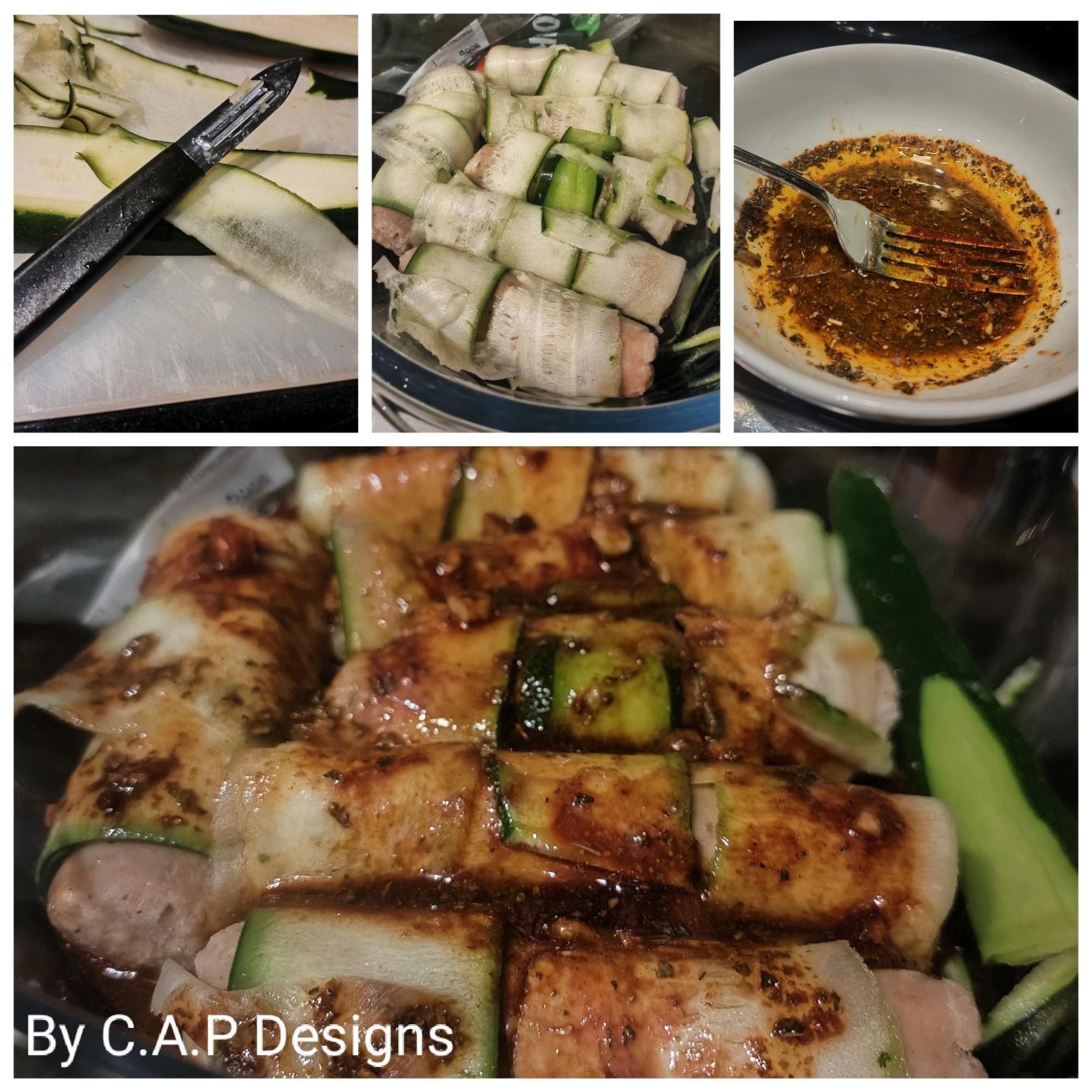 First of all, cut the courgette into long thin slices (peeler recommended) and wrap them around the sausages.