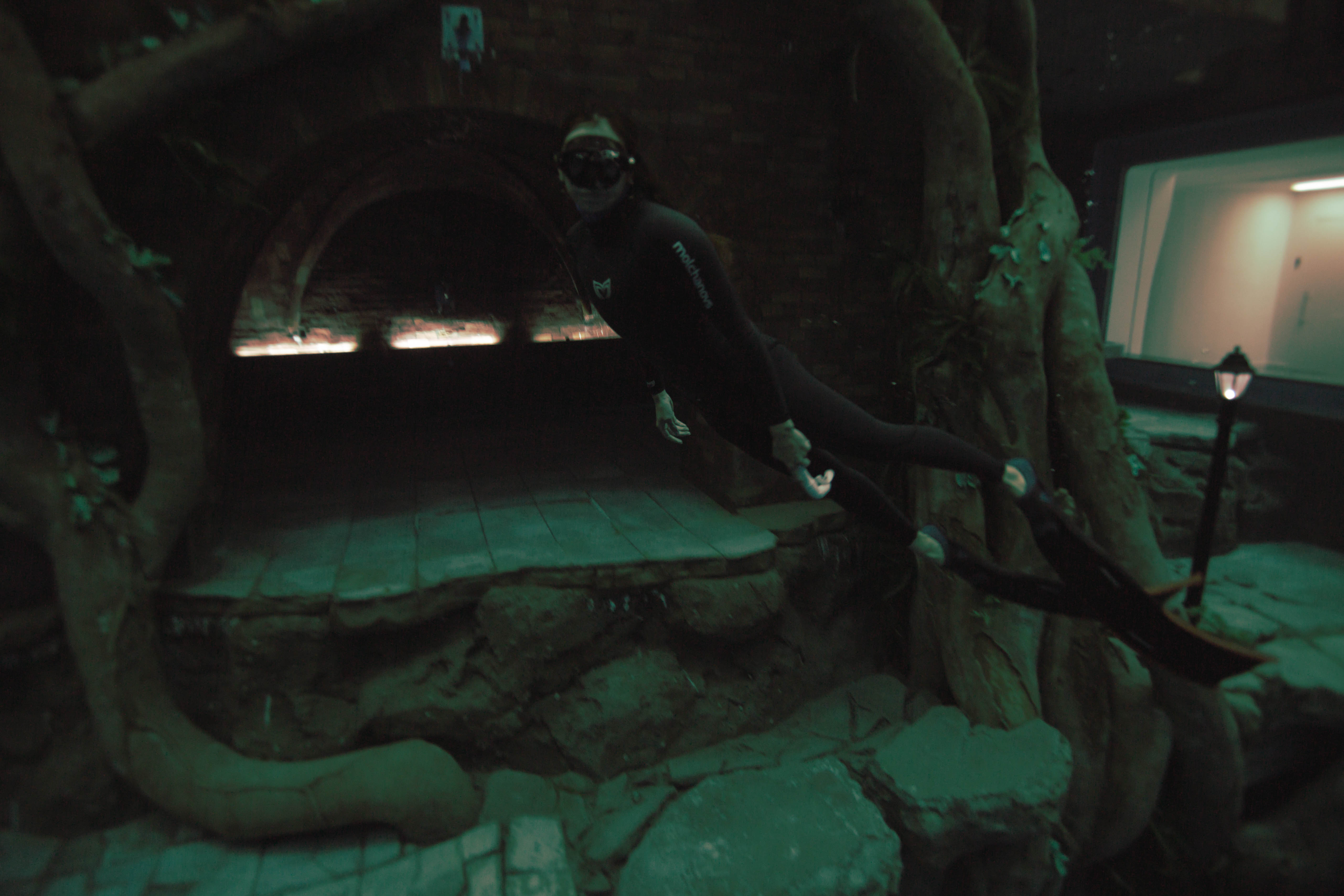 The first thing you’ll notice is the seemingly endless tunnel that plummets 60m/~180ft beneath you. Staring into the deep abyss felt daunting until I began to relax my gaze. Game tables, medieval-looking tunnels, and a variety of architectural structures revealed themselves as my eyes adjusted. I saw lounging areas where divers and onlookers could exchange greetings through the plexiglass and I imagined restaurant guests laughing as divers waved or made faces back.