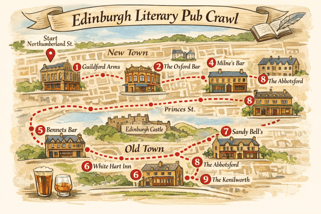 Edinburgh’s pubs aren’t just places for a pint; they’re chapters in the city’s ongoing story. From Rebus’s haunt in the New Town to the poetic ghosts of Burns in the Grassmarket, here’s your route through literary history, pub by pub. Starting in Queen Street Gardens, just above George Street.
